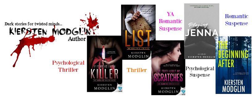 Hi! I’m Kiersten Modglin. I’m a suspense author and I write all subgenres of suspense (so far— psychological, YA, domestic, and romantic)
