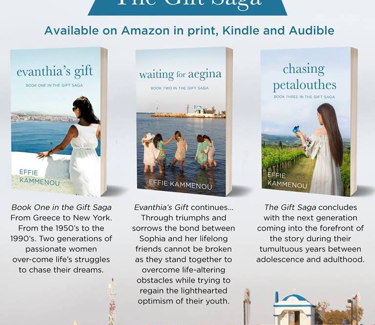 I would say the main genre is women’s fiction. Even though the three books are part of a trilogy, the focus and genre of each book is a little different. Evanthia’s Gift is a women’s fiction / contemporary romance / family saga with historical elements. Waiting for Aegina is strictly women’s fiction with some romantic elements. Chasing Petalouthes is a women’s fiction / contemporary romance coming of age story.